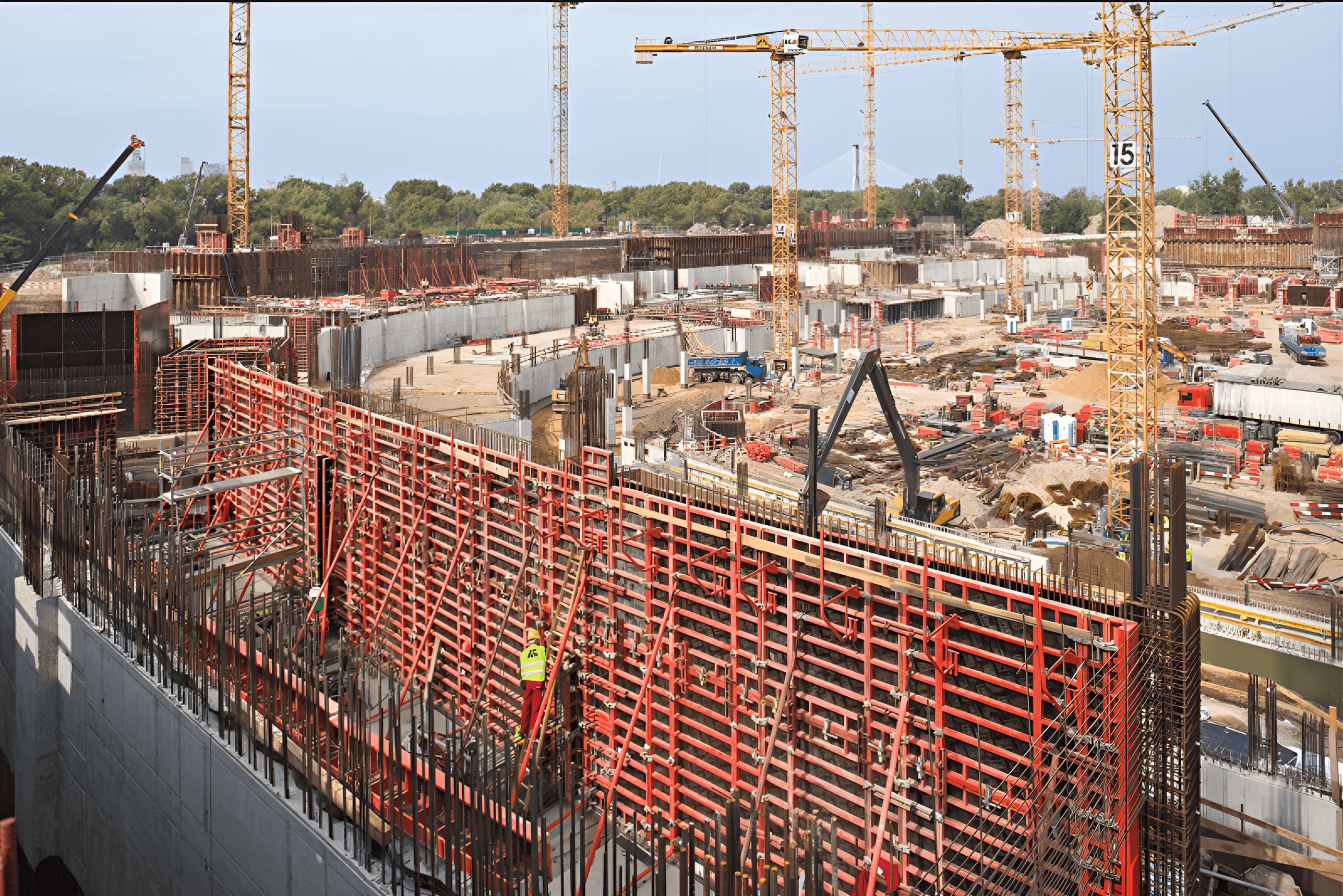 Formwork plays a critical role in shaping the concrete elements of a stadium, serving as temporary molds until the concrete hardens. Given the architectural complexity and massive scale of most stadiums, the formwork must be adaptable and robust enough to handle significant volumes of concrete while maintaining precision.